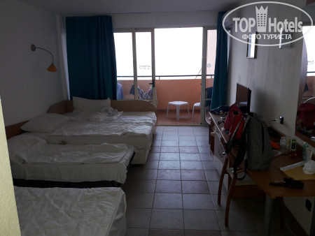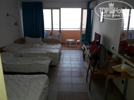 Номер: У номері була жахлива постіль (стара, рвана, одної наволочки взагалі не було, подушки і о діяла дуже старі позбивані). Мебель стара, щоб не перечислювати усе старе. У номері був телевізор з ПЛОСКИМ екраном) а то я пишу що все старе))), холодильничок пустий! Фен в ванній кімнаті — це все що було з техніки. Вішалочки в шафі, речі вистачало розвісити. Чого це пишу бо готель себе позиціонує як чотири зірки. Кришку унітазу мусів зняти тому що ти сідаєш на унітаз вона упирається тобі у спину. Деталі та не приємні деталі. Номер чистий! Прибиральниці незнаю чи так усюди унас були молоді дівчата які добре прибирали. Щоденно заправляли лійжка, мили підлогу, виносили сміття. Та все одно ми ходили взуті по номеру, тому що коляска на колесах пісок і так з моря приносиш пісок, не приємно лягати в ліжко з піском на ногах. Жінка ходила в тапочках які ми взяли з собою а ми з сином в шльопках. Пару днів ходив просив чайник що дали у номер бо суміш треба готувати малом. Ми собі і думки не мали що в 4 зірковому готелі не може бути чайника в номері. Спочатку адміністратор сказала що гарячу воду можна набрати в барі з каво машини, якось вона в стигла я її попробува і мені сильно зжалось серце що таку воду я даю пити дитині. Вода на стільки була ггггге що не передати, з хлоркою, трубами чути страшно. Я на повишених тонах попросив чайник, вже несуть сказала адміністратор. Ще пару раз я ходив щоб ВИБИТИ ЧАЙНИК. Купив воду в магазині і тоді заспокоївся з їдою для дитини.