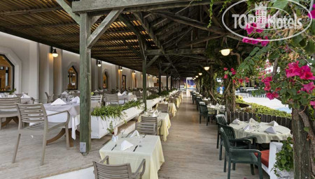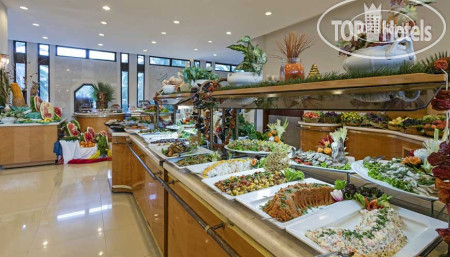 В целом, на завтрак омлет, глазунья, отварные яйца, хлопья всякие, каши пресные не понравились, большой выбор булочек; салат-бар нормальный, супы на любителя, всегда есть любые оливки, много картошки фри, сладости разные, фрукты (яблоки, груши, виноград, апельсины, дыни, бананы только на ужин) сладкие, на гриле готовили котлеты, рыбу, курицу, много отварных и тушёных овощей (понравилась бамия, артишок, шпинат, кабачки), иногда обнаруживала тушёную говядину. Также ходили в ресторан a la Carte. Там на выбор был ягненок, курица и рыба. Мы выбрали рыбу. Подавали суп, сибаса с гарнирами. Вкусно.