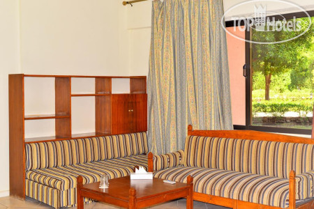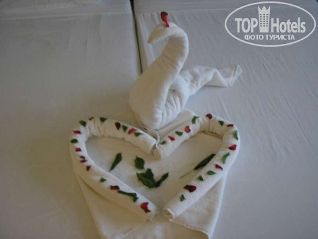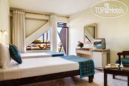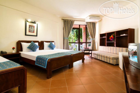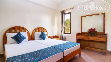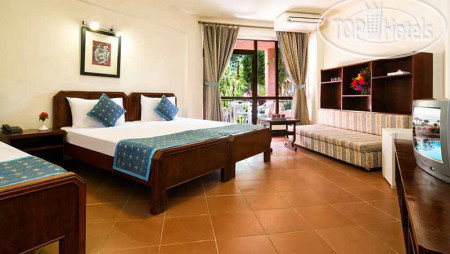 Не скрою, что первое впечатление от отеля было не совсем радужным. Мы шли к номеру. Я замечала окурки, использованные пластиковые стаканы постояльцев. Номер предложили в основном корпусе без балкона,хотя и большой: в коричневых тонах, не особо чистый, со скромной старой мебелью. Пребывая в шоке, попросила поменять номер. Шоколад и 20 долларов помогли такой номер найти в ближайшем к зданию ресепшен бунгало на 2 этаже. Номер малюсенький. Для троих не рассчитан. Мебель старенькая, деревянная. Душ закрывается только шторкой. Но есть чайник, сейф и мини бар (маленький холодильник). Все работало исправно, в том числе кондиционер. Сдвинули кровати, места стало немного больше. Порадовал вид из окна на сад и море.