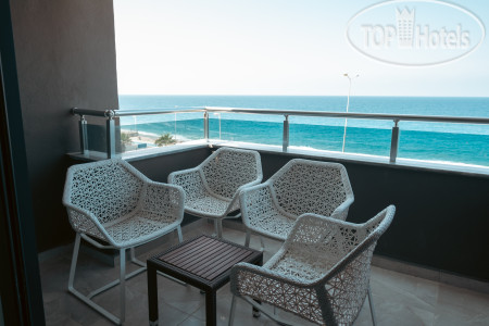 Отель построен так,что балконы из всех номеров выходят на море,однако с нижних этажей его вряд ли будет видно.