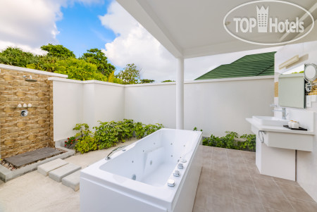 Вилла на пляже тоже хорошая, но чуть меньше размером, но достойная! Душ на улице-атмосферно. Свой бассейн и кусочек пляжа-шикарно! Мы остались довольны номерами, большего и не надо!