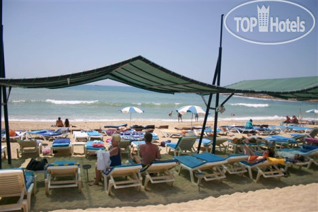 Пляж отмечен голубым флагом и имеет общую территорию для двух отелей сети «Özkaymak». Вход в море песок с мелкой галькой, поэтому проблем быть не должно. Встречаются плиты, но линяя плит ближе к пирсу. C пирса имеется спуск по лестнице