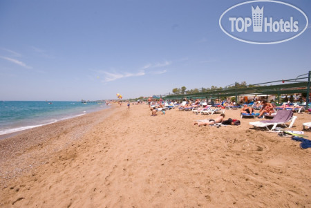 На самом пляже отличный мягкий песочек. Уборщик пожилой дяденька бегает сметает песок с шезлонгов, убирает стаканы и мусор, молодец. Очень радуется, если ему говорить по-турецки здравствуйте, спасибо. Довольно много пластиковых столиков, но конечно на всех не хватит.