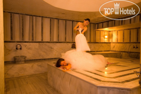 Ходили один раз в хамам. Сауна и хамам бесплатно. Нам сказали, что в хамам пока нельзя, т.к. там дамы. Не поняли, они же не голые? Пошли пока в сауну. Градусов 60, наверху 70, не наше, конечно. Вышли, увидели открытую настежь дверь в хамам и выходящих двоих раскрасневшихся здоровых турецких мужиков. Ну, поняли, почему нельзя было в хамам. Зашли, все конечно выстужено, стол еле теплый да и не было желания пользоваться им после увиденного. Полотенца положить там негде.
