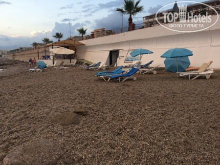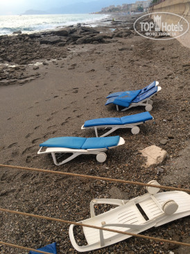 Пляж через дорогу, по подземному переходу, прям с территории отеля. Лежаки бесплатные, но их не очень большое количество. Под ногами галька, на входе есть большие камни, но они почти на уровне с дном, также можно пройти между ними. Вода чистая.