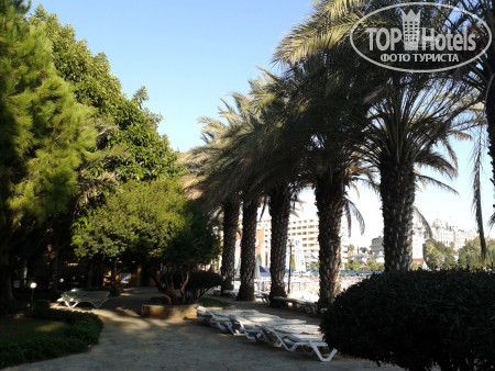 Территория красивая и зеленая, много цитрусовых деревьев.