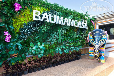 Территории нет совсем - если встать спиной к морю за дорогой, то... Перед отелем небольшая кафеха (халявные завтраки не здесь). Справа небольшой рыночек, дальше от моря за ним болото, а правее всего этого стройка (четные номера туда смотрят - не айс видок). Слева тупиковый проезд между зданиями Баумана и массажно-поедальными сарайками и чужим отелем. В этот проезд выходят только двери Баумана, соответственно, на въезде в него с дороги стоит охранник, который по идее должен пропускать только сотрудников и клиентов Баумана, но у него память переполнена, всех меняющихся постояльцев запомнить не может, поэтому просто улыбается всем и цветочки поливает. Вся публичная "территория отеля" сводится к крышам. Над 1м корпусом есть небольшой бассейн, но прикольный - там в воде есть бетонные табуретки перед окном бара, откуда, по идее, должны напитки предлагать. Однако идея накрылась медным тазом, бар заколочен. Над 2м зданием (2-3 корпус) ничего нет - можно футбол гонять. Над 3м зданием (4й корпус) большой бассейн с навесом - там в основном все и толкутся днем. Между 1-2-3 зданиями есть переходы по крышам - можно гулять. Еще над 1м и 3м зданиями есть столики (2шт. всего) - там душевно можно покушать вечерком, если не занято. Над 4м зданием (5м корпусом) ничего нет (или мы не освоили), перехода по крышам туда точно нет. Еще есть бассейн как бы на 2м этаже над концом этого тупикового проезда - проезд как бы под этим бассейном заканчивается. Сходили туда 1 раз - вода налита в бассейне, чистая, но вокруг разруха - топчаны стоят стопкой, кругом мешки с цементом и прочий строительный мусор и дядьки ходят - вообще без желания искупаться в глазах, но со странным желанием что-нибудь построить. В 3м здании от бассейна с крыши можно спуститься по лестнице на полэтажа - там туалеты, душ. Есть и сауна - ушатанная нехило, но живая. Ее включать нужно дважды - с ресепшн по часам включают блок управления печкой (если правильно помню часы работы: 11-13, 14-16, 17-18). На нем (слева от входа снаружи) уже сами постояльцы должны нажать кнопку (правая нижняя) включения печки - только после этого совместного действа печка врубается. Выше 70 воздух не разогревает, но горячее (немного), чем на улице :) Еще там же напротив мыльно-грельного блока находится спортзал - ушатанные беговые дорожки все же запускаются. Бильярдный стол стоит, но ни шариков, ни кия. Про шарики еще ходят слухи, что их на ресепшн видели, про кий и слухов нет (но можно ветку отломать :)) Железок всяких без электричества которые и которые не сопрешь в сумке - полно. Кондюка в спортзале нет, окон, вроде бы, тоже - только вентиляторы.