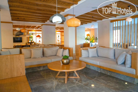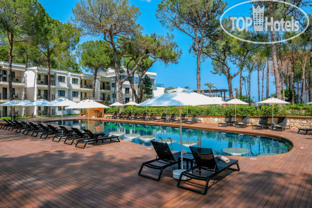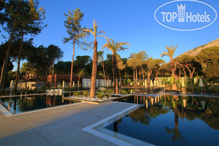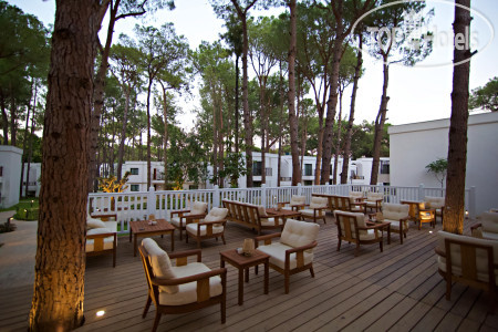От аэропорта, по небольшим пробкам в Анталье и тремя остановками в отелях по пути, мы добрались за час с небольшим. Приехали в 12:30, нас радушно встретили, предложили оставить чемоданы и сходить на обед в главный ресторан. Лобби небольшое и красивое, с баром, работающим круглосуточно, выходя из него попали на террасу с удобной мебелью и приятной атмосферой, где в тени сосен и зонтиков можно хорошо провести время и днем, и вечером.