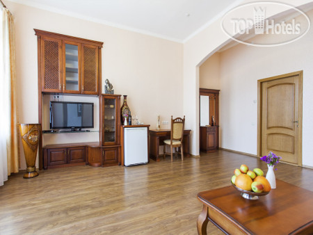 Номер - (брали стандарт) - 2 комнаты +совмещенный сан.узел, есть балкон(фото прилагаю). Номеру ставлю твёрдую 5(пять)!!! Есть всё - тапочки, халаты; полотенца для пляжа(бассейна), в шкафчике - ложки, вилки, бокалы для вина, пива, стопки; чайник электрический, чайник для заварки - к ним чашки и блюдца; даже штопор и кухонный нож положили+ ещё целая куча разных тарелок для удобства. В сан.узле лежат наборы - зубные щётки с зубной пастой, шапочки для душа, мыло, косметик.наборы, шампунь в дозаторе; Телевизор и кондиционер.
